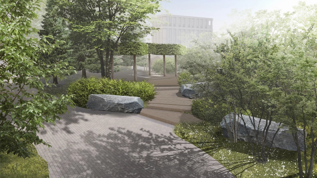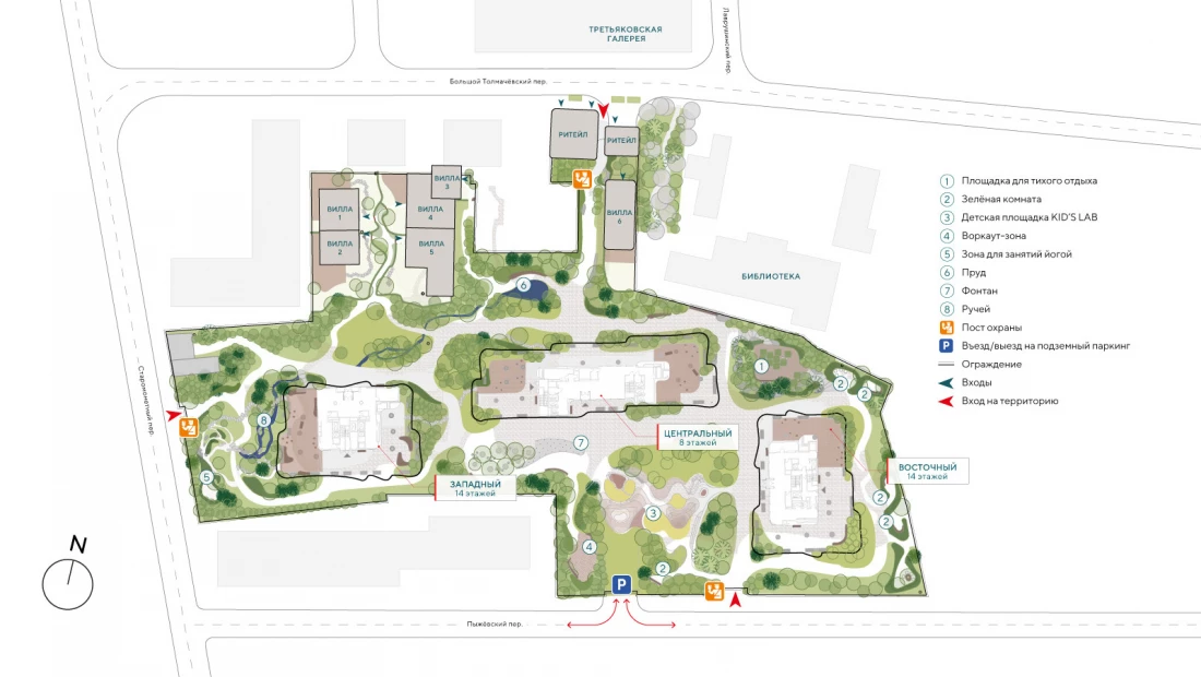 Тишина и простор центра. Двор-парк 1,4 га: фонтан, ручей, зоны для воркаута и тихого отдыха, детская площадка. Clubhouse с фитнесом с 25-метровым бассейном по стандарту Fit Lab и игровой комнатой по стандарту Kid’s Lab.