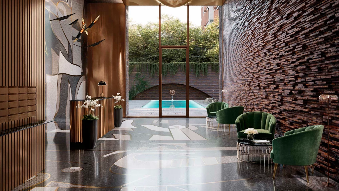 Лобби спроектировано так, что соединяет историческую и современную части дома. Высокие витражи и шестиметровые окна «в пол» делают пространство холла объемным. Во внутреннем дворике располагается пруд с фонтаном.