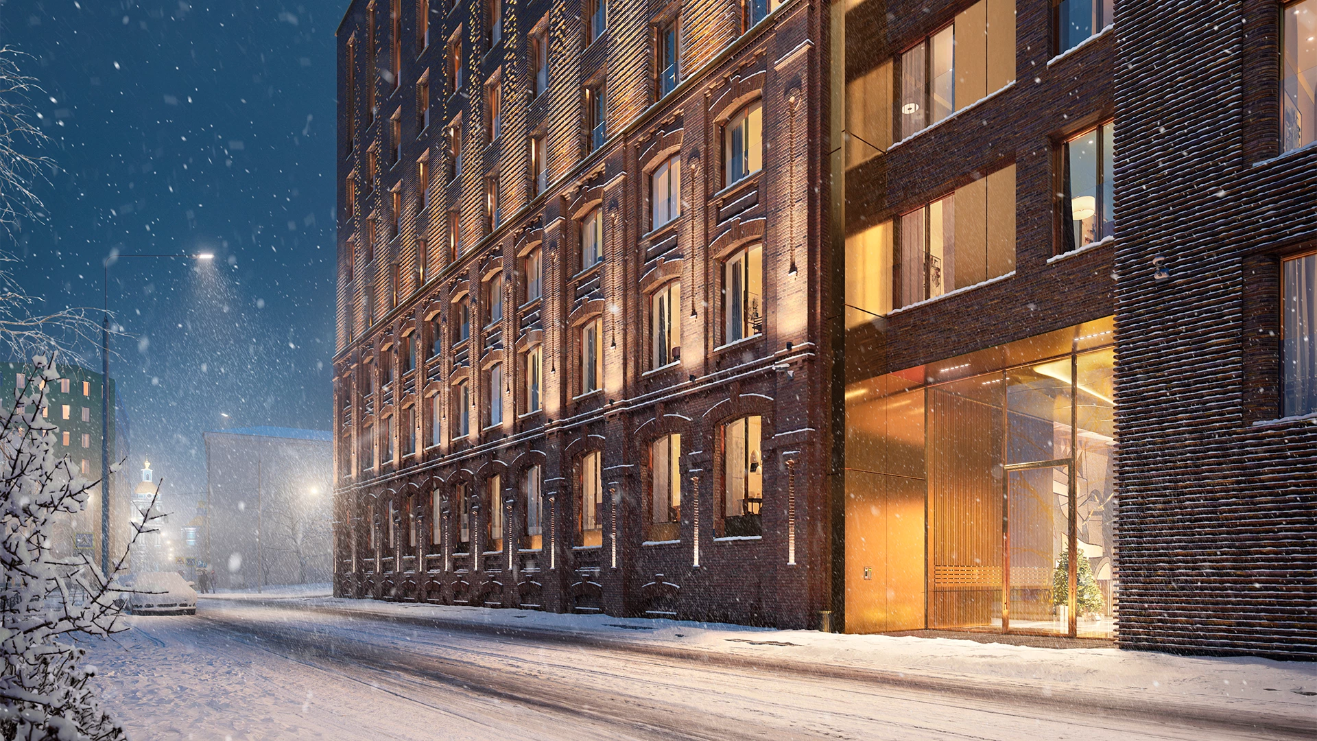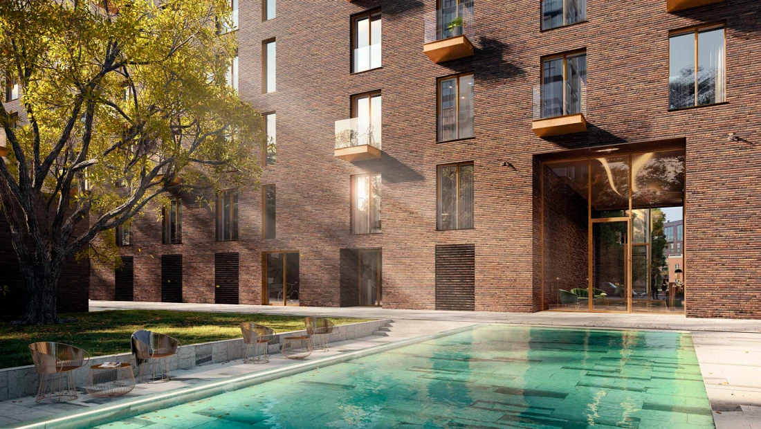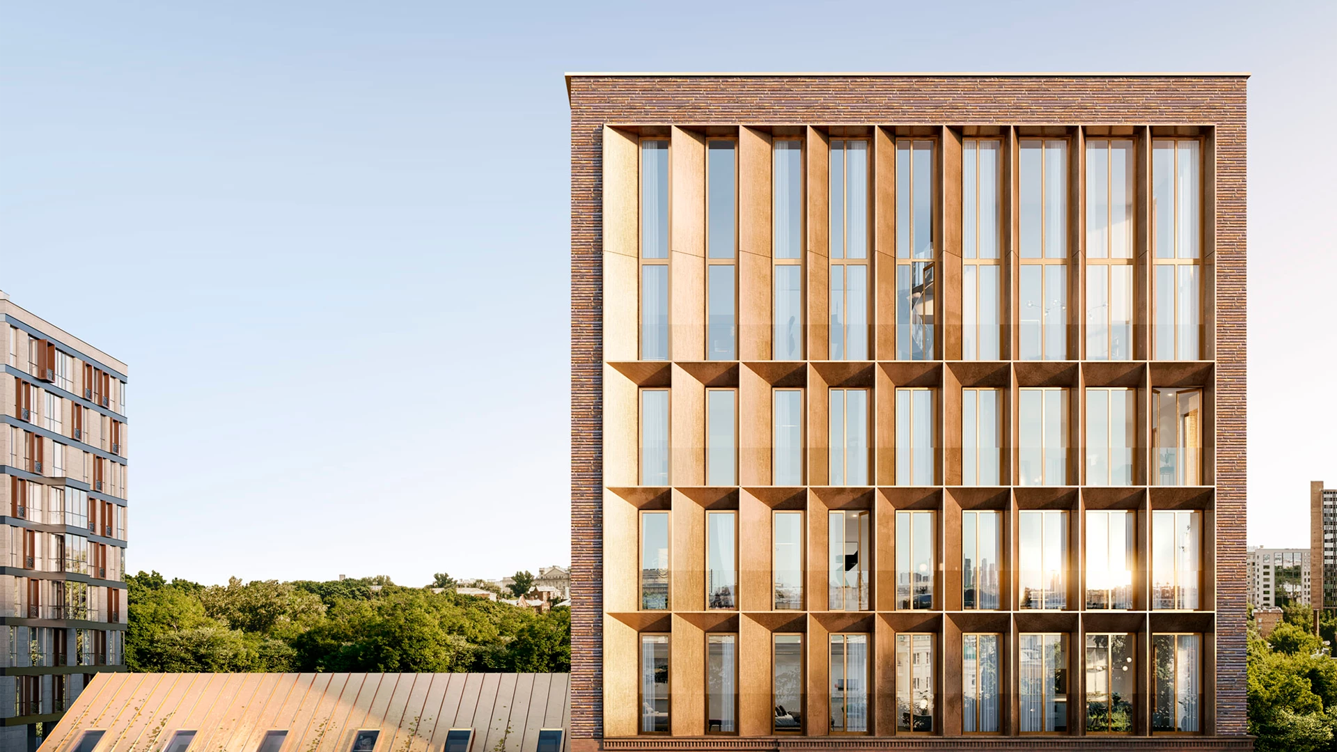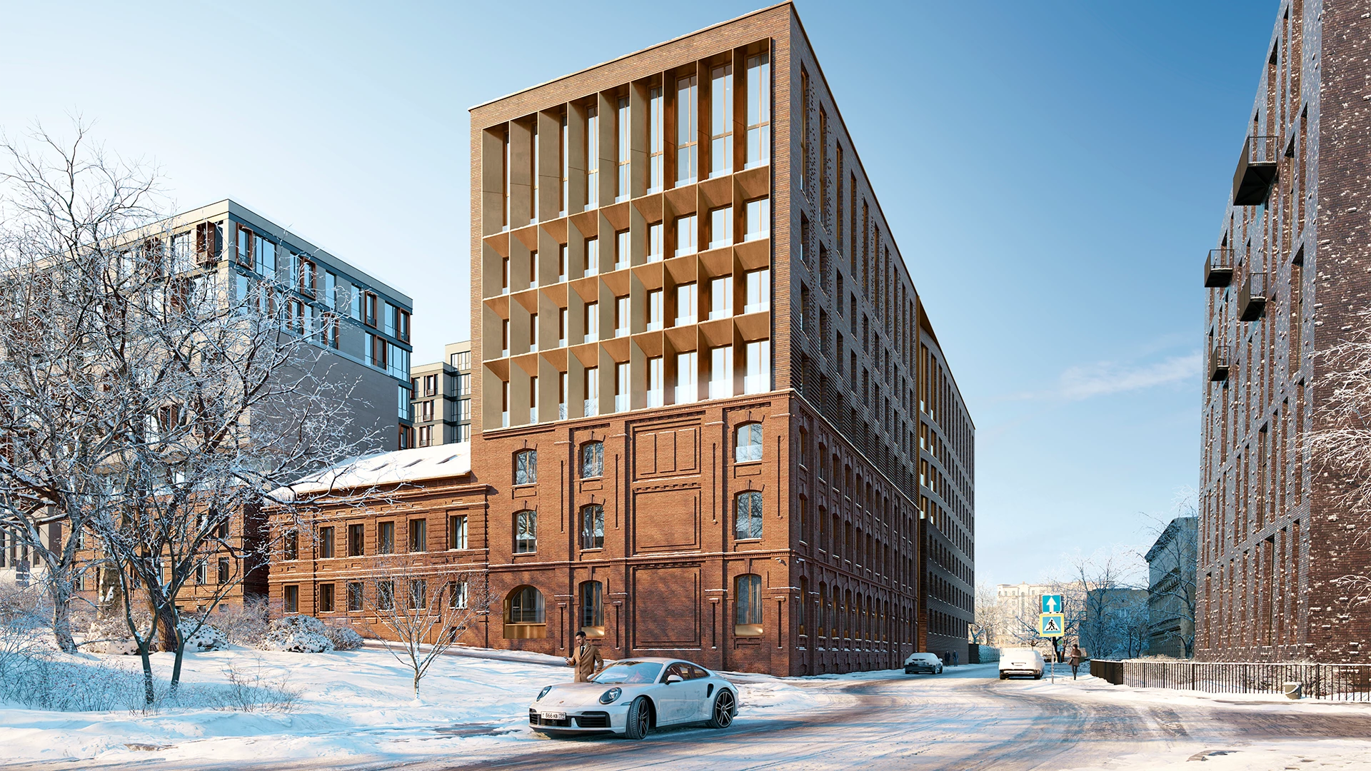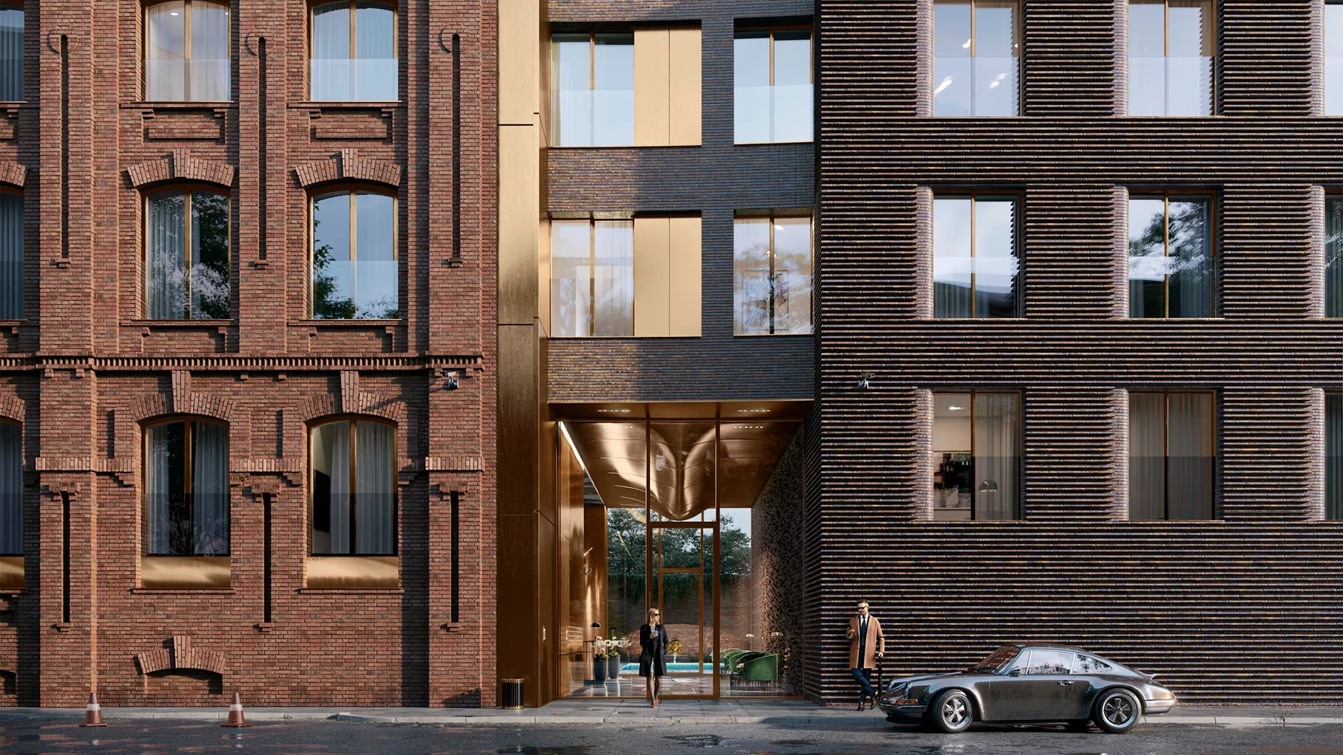 Часть фасада – бережно восстановленная кирпичная кладка XIX века стен исторического здания. Современная часть фасада построена из клинкерного кирпича и гармонично дополняет исторический.